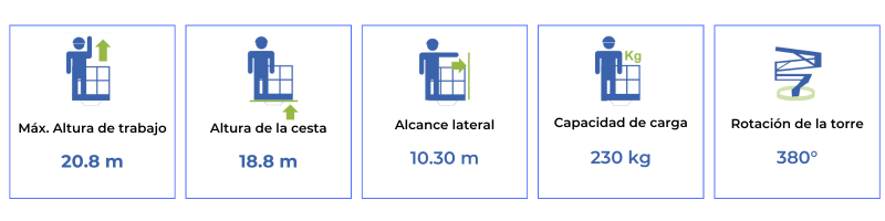 Destaca por su capacidad de elevar 230 kg (2 operarios + material) sin restricciones en toda la zona de trabajo, con estabilización automática, control remoto multifuncional y tecnología bi-energética (diésel y eléctrica) con 0% emisiones, ideal para espacios interiores.
