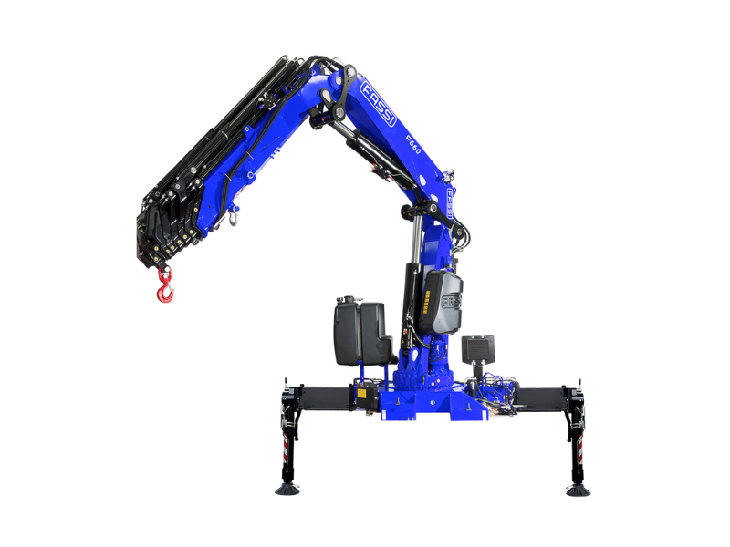 Brazo grúa Fassi con dotación electrónica/hidráulica, ideal para camiones de tres o cuatro ejes. Cuenta con ocho extensiones hidráulicas y doble biela. Se distingue por su gran capacidad de elevación y su diseño estructural ligero para optimizar el peso ideal para montar en camiones de tres ejes con un PBV de 32 Ton en adelante.