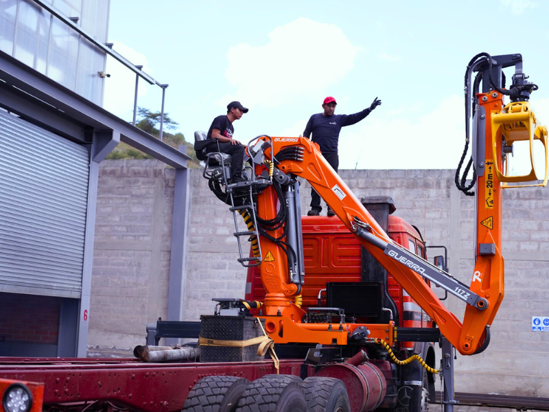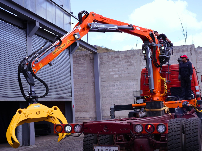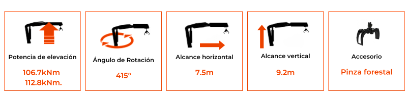 Grúa forestal diseñada según norma “EN 12999” clase H1-B4, con sistema de giro piñón-cremallera en baño de aceite, estructura robusta, granallada y con puesto de mando ergonómico.