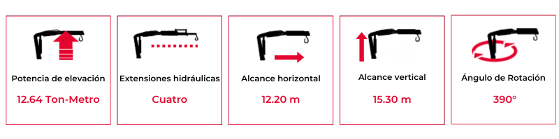 Brazo Grúa Fassi de cuatro extensiones hidráulicas con base de acero fundido para máxima estabilidad, ideal para camiones de dos a tres ejes o con un PVB de 12 Ton en adelante.